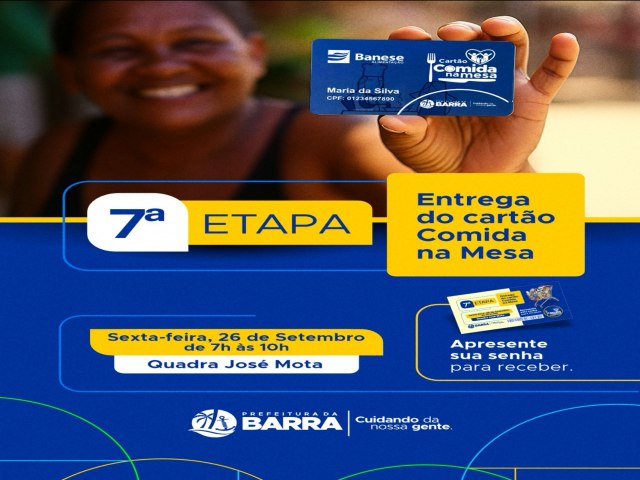 Mais uma etapa de entrega do Cartão Comida na Mesa será realizada pela Prefeitura de Barra dos Coqueiros, por meio da Secretaria de Assistência Social, na próxima sexta-feira, 26. O evento será realizado na Quadra do José Mota, a partir das 7h.